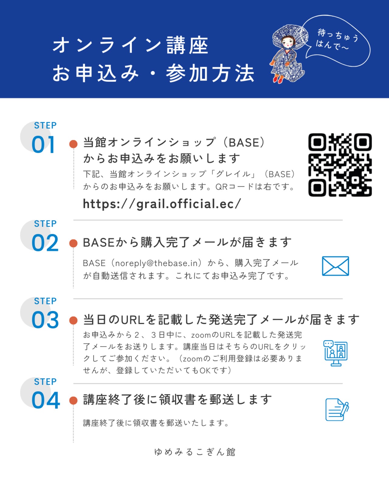 お申込み後、2、3日中に、zoomのURLを記載した発送完了メールをお送りいたしますので、講座当日はそちらのURLをクリックしてご参加ください。(zoomのご利用登録は必要ありませんが、登録していただいてもOKです)