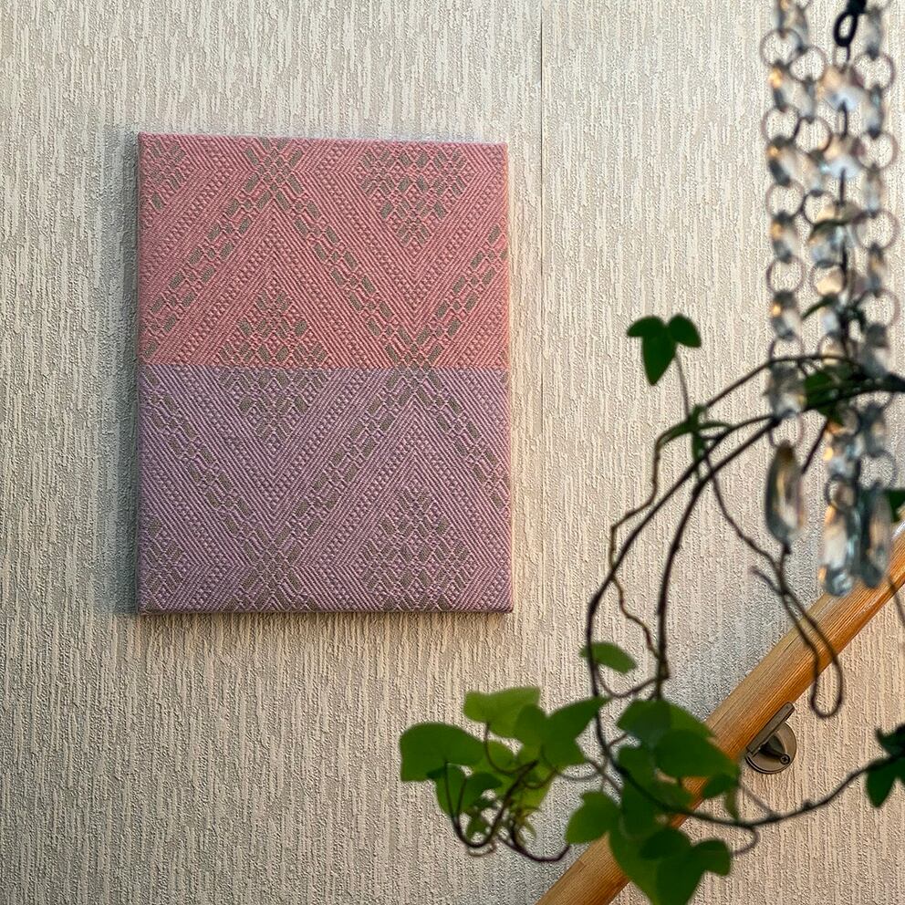 ◆木製パネルに、こぎんを刺した布を取り付けてあります。
